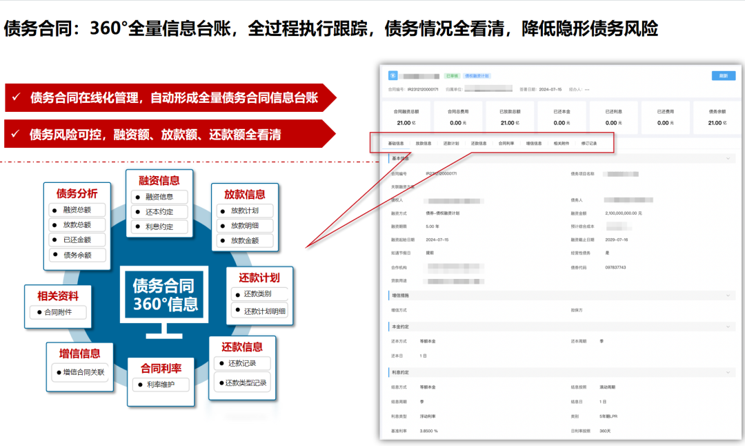 近年来,两江控股业务规模迅速扩张,历史沉淀的项目投资成本和应收款项规模也日益增长,传统线下手工台账数据整理工作繁重,计算量大,数据采集与分析难。通过此次数字化债务管理系统的实施上线,业务部门和明源实施团队共同梳理了近400份债务合同,并为每一份合同建立了金额、约定、放还款明细、记录等在内的360°全量信息台账,厘清了两江控股的债务家底。基于此,通过重新梳理业务流程、建立管理规范、优化审批流程和表单,两江控股已经实现以下四个场景的在线化管控。1. 企业负债可控:实时掌握集团及下属单位的负债状态和年度偿债情况,确保债务透明化。负债状态符合企业的经营需求,不存在超出公司所能负担的债务状态2. 融资执行有序:动态跟踪年度融资计划金额、完成率和放款总额,确保本年度的融资计划执行有序,保证充足的现金流支撑公司的正常经营活动。3. 债务结构合理:智能识别结构性风险,优化债务期限与类型配置。确保公司的当前负债,不存在结构性的债务风险,重点监控集团债券的债务占比。4. 债务成本可控:综合评估融资成本,定位高成本项目并制定优化策略,降低财务负担。此外,系统还创新构建了资产全生命周期数字穿透监管闭环链条,实现融前、融中、融后全过程精细化管理:1.融前:高效收集融资计划数据,科学规划融资需求。2.融中:债务合同全程在线化管控,自动测算还款计划。3.融后:动态监控放款及还款情况,确保资金流动可控。债务管理系统将融资债务业务进行过程管控,保证业务数据动态可知,将逾期风险遏制在摇篮里。1. 合同透明化管理:债务合同的关键信息(如融资信息、还款计划、增信措施等)全部在线化,确保数据可追溯、可审计。2.智能预警机制:通过风险评估模型,自动测算还款节点,提前预警潜在风险,避免因疏忽或沟通不畅导致的逾期问题。3.资金优化调度:实时监测债务指标,辅助资金筹划与调度,提高资金使用效率,降低财务风险。两江控股的债务管理系统以数字化为抓手,实现了债务“可知、可控、可优化”,为国企债务风险管理树立了标杆。其成功经验可归纳为以下三点:1.技术驱动,提升管理效率:数字化系统解决了传统手工台账数据滞后的问题,为决策提供了实时数据支撑。2.风险前置,强化预警能力:智能预警机制帮助提前识别风险,为债务结构优化赢得时间窗口。3.数据赋能,优化资源配置:全量信息台账为债务结构优化和融资计划制定提供了科学依据。在债务风险防控与高质量发展的双重目标下,两江控股的数字化债务管理实践为城投公司提供了可复制的范例。未来,城投公司应积极拥抱数字化转型,通过技术驱动、风险前置和数据赋能,实现债务结构优化与风险可控,在数字化基础上,持续优化积极探索,建立债务全周期风险控制能力。明源认为,除了数字化基础外,还需要在以下四个方面加强能力:1.严格执行融资计划:合理预测资产负债率,严格控制负债规模和综合融资成本。2.加强流动性管理:优化债务期限结构,分散偿债压力;设立资金池,确保项目资金及到期本息的及时支付。3.推动产业化转型:通过重组整合优化资源配置,培育新兴产业,提升信用评级和融资能力。4.关注政策动向:紧跟国家政策调整,灵活应对监管要求,避免政策变动带来的融资限制。未来,两江控股将继续深化系统应用,进一步完善管理机制。明源云也将持续赋能,为更多国资国企提供专业服务,助力高质量发展。