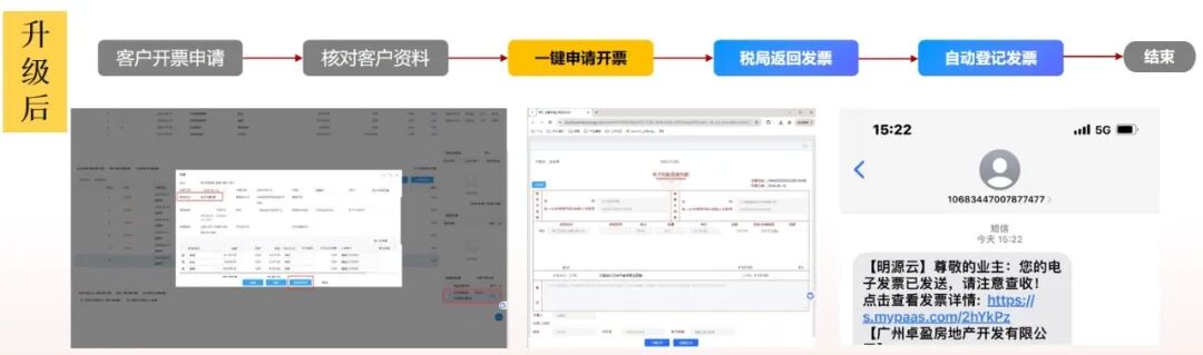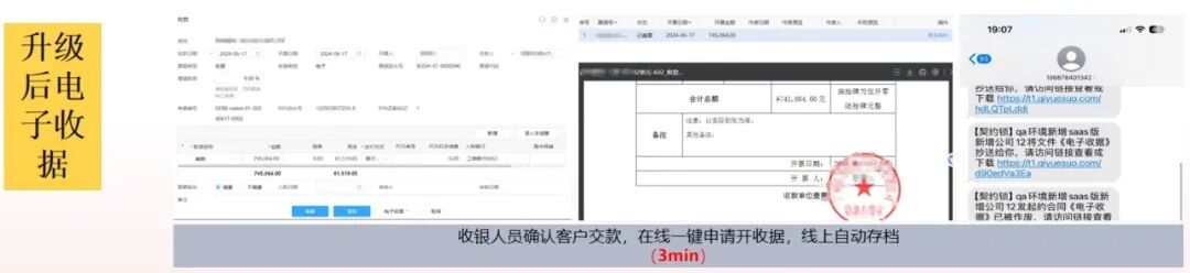 开票环节实现了直连税局平台,可一键开具、批量开具电子发票,在提升整体开票效率的同时,有效降低了项目集中交付压力。发票还可以通过手机短信直接发送给客户,大幅提升客户体验感和满意度。数电发票应用自上线以来,凭借其操作的便捷性和业务高效性,得到了一线用户的广泛好评。