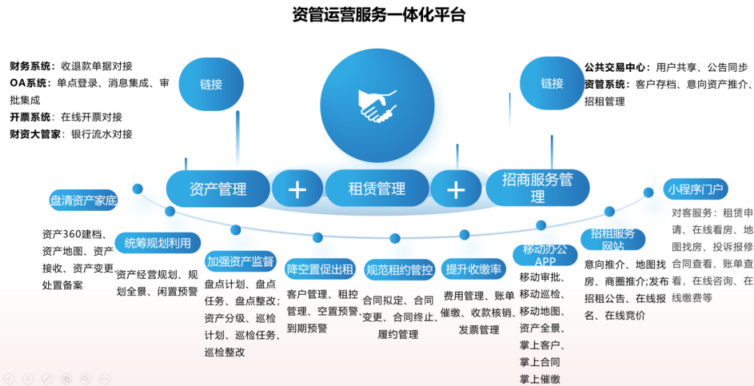 招商与拍租结合、招商能力和运营能力结合、区域服务与租户服务结合,实现从空置房源预警监控、在线招商推介、在线报名、竞价、成交到服务运营一体化的全链条闭环。