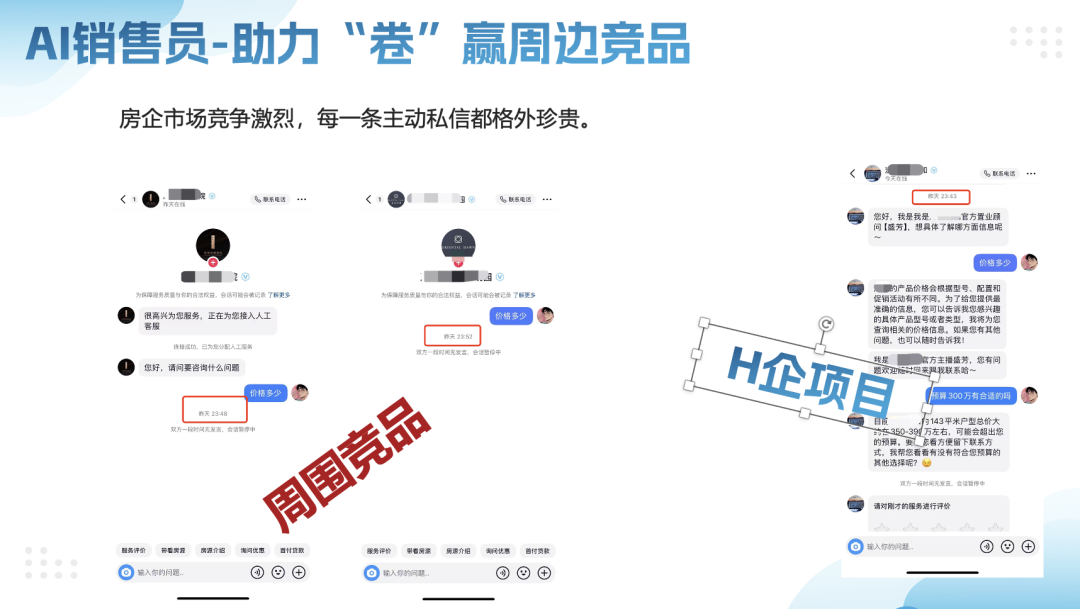 在直播、短视频这类即时互动场景中,研究表明,若3秒内无响应或30秒内无法引起客户兴趣,流量便会迅速沉入公域。但由于项目新媒体团队人员配置有限,秒级应答人力难以胜任。面对这一挑战,H企主动引入明源云AI销售员的力量。在H企的线上营销实践中,一旦发现用户有点赞、转发、留言等高意向行为,AI销售员便立即启动,在客户兴趣最浓烈的“黄金时刻”精准介入,主动私信撩客,有效激发客户表达更深层次的看房或购房诉求。