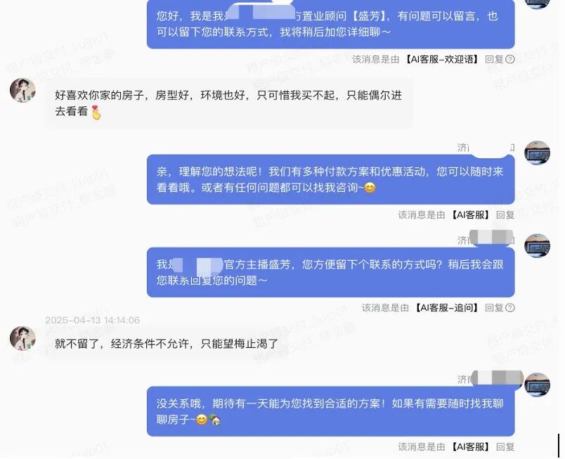 对于线上咨询中常见的复杂或“非理想”客户(例如,主动提出“预算不足”的潜在客户),人工顾问在高强度工作下可能难以持续保持耐心和专业引导,容易错失转化机会或未能充分挖掘客户价值,影响整体线上获客转化率。而AI销售员则会积极把握每一次互动机会,灵活应变回复,为客户提供情绪价值。