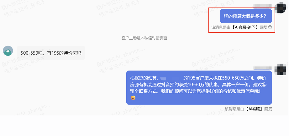 当刘先生未继续回复时,AI基于其行为智能判定其为高意向客户,自动触发【AI客服-追问】询问预算。客户回复“500-550万”后,AI迅速匹配房源价格区间(550-650万),并强调抖音专属优惠可拉低总价门槛,同时以“一户一价”制造稀缺性与紧迫感,顺势引导客户留资。