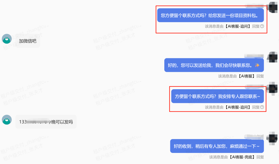 捕捉到客户明确意向信号后,明源云AI销售员立即趁热打铁触发意向留资追问,获取客户联系方式。刘先生最终留下有效电话,经置业顾问跟进,于4月14日成功签约。全程仅通过AI私信交互即完成高意向客户筛选与初步转化。