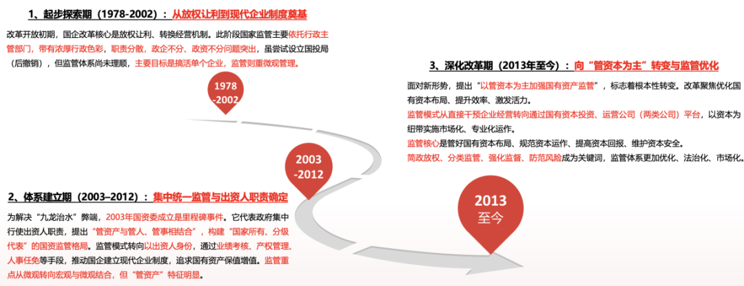 起步探索期(1978-2002):改革开放初期,国企改革以“放权让利”为核心,监管依托行政主管部门,行政色彩浓厚,“九龙治水”问题突出,监管重心在微观层面,政企不分矛盾显著。
