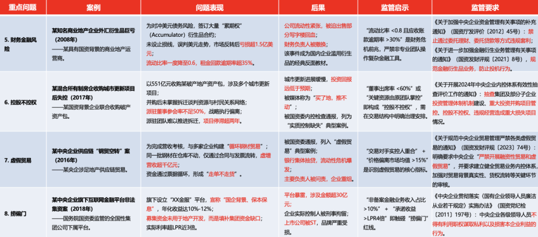 国资委、平台公司对三级及以下企业、境外机构的风险感知滞后,甚至违规操作易被“层层上报”机制过滤或掩盖等风险。随着国有企业规模扩张、业务多元化(跨行业跨领域经营常态化)及市场经济环境复杂化(国际竞争加剧、金融工具创新),这些局限性日益凸显,具体表现为以下监管突出问题: