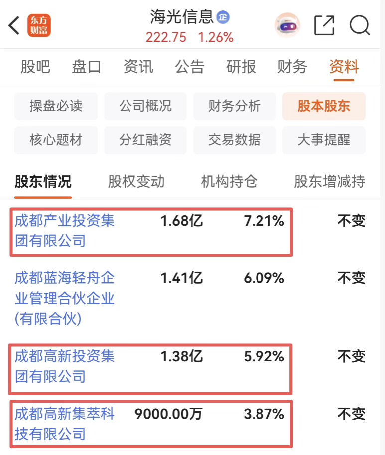 海光信息IPO前,成都国资两次转让,不仅收回了投资成本,还赚不少。2022年海光信息上市之后,股价一路上涨,今年9月最高攀升到了278元的高位,冲高回落之后,目前也还有220元左右每股。而目前成都产投、成都高投以及成都集萃合计还持有3.96亿股,以最高价计浮盈超1000亿元,以目前的价格计算也浮盈近900亿元。