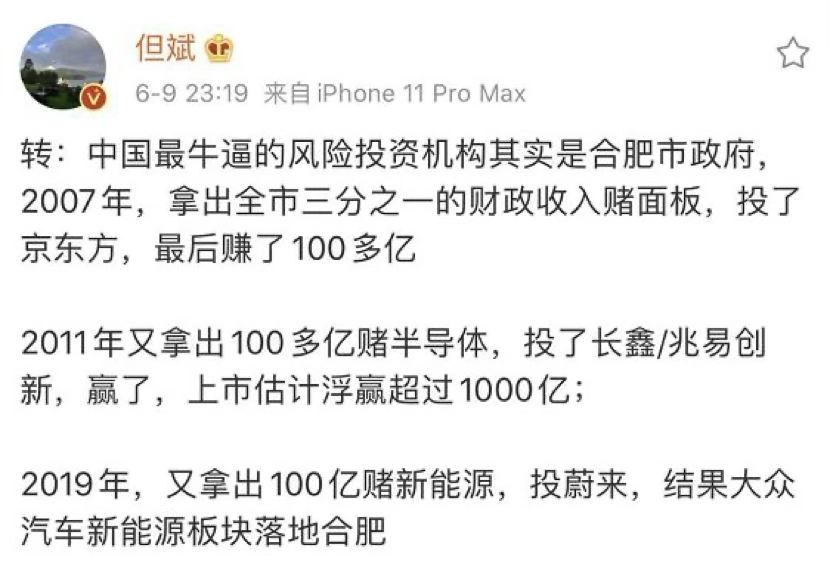 「中国最牛逼的风险投资机构其实是合肥市政府!2007年,拿出全市三分之一的财政收入赌面板,投了京东方,最后赚了100多亿;2011年又拿出100多亿赌半导体,投了长鑫/兆易创新,赢了,上市估计浮赢超过1000亿;2019年,又拿出100亿赌新能源,投蔚来,结果大众汽车新能源板块落地合肥。」
