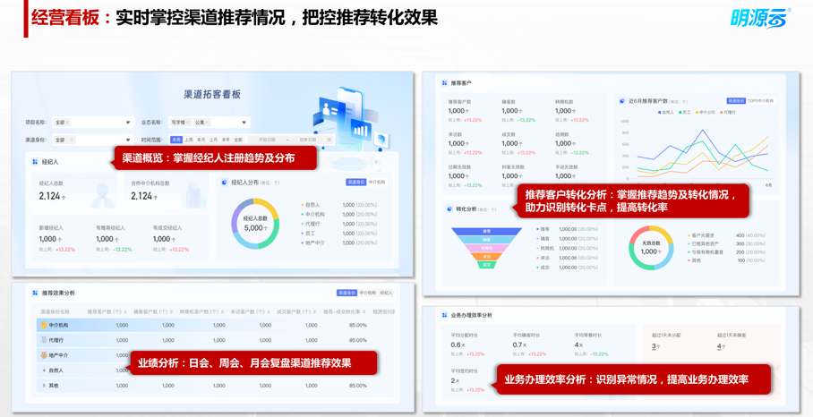 最后,各渠道的推荐效果,如何有效评估?系统自带渠道转化分析功能,中介机构、代理行、自然经纪人、内部员工……每个渠道的转化效果都能一键生成,实时查看并掌握各渠道效果,进而优化渠道结构。